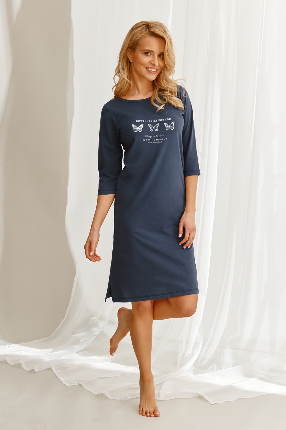 Стильная женская сорочка Omena. Сорочка выполнена из качественного и мягкого хлопка темно-синего цвета, свободного кроя, с рукавами 3/4 и круглым вырезом горла. Длина модели выше колен, по бокам небольшие разрезы, на груди по центру украшена принтом бабочек и надписью "Butterflies for you".