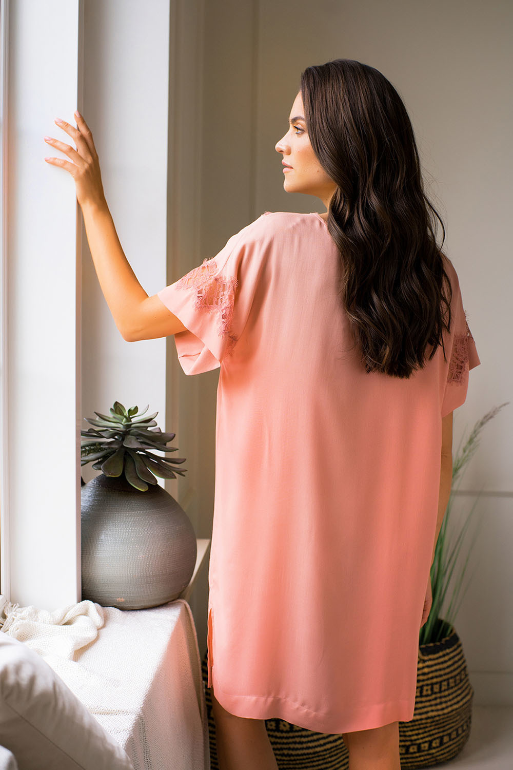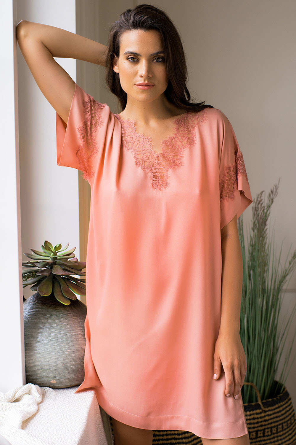 Элегантная домашняя туника свободного кроя и длиной выше колен. Модель выполнена из мягкой, натуральной вискозы высокого качества. Глубокий V-образный вырез и короткие рукава украшены эффектной вставкой из шикарного кружева с растительным узором. Комфортная и при этом женственная модель для дома и отдыха.