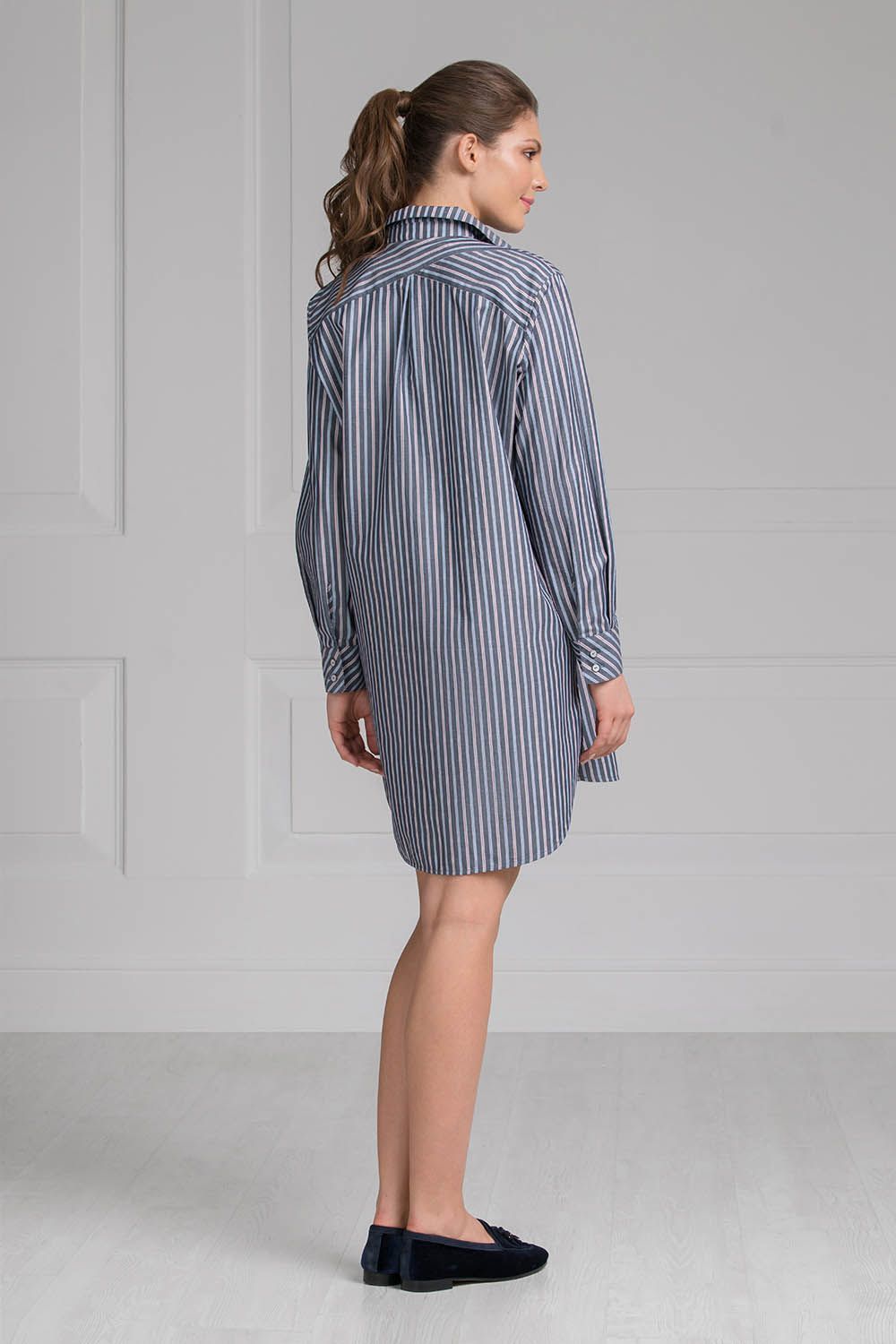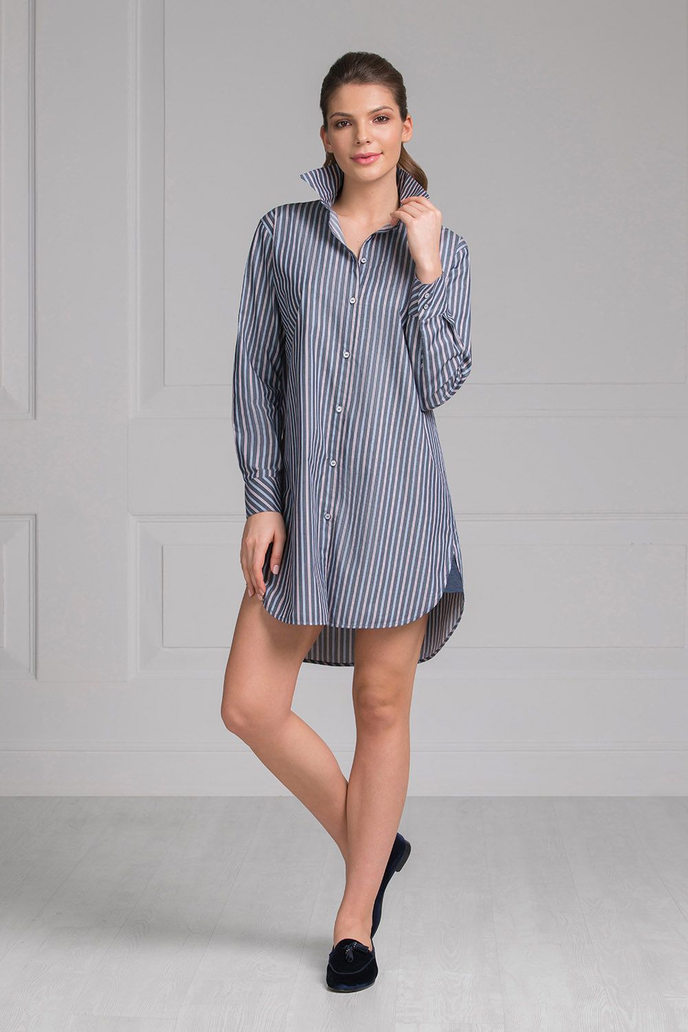 Красивая, легкая туника выполнена из натуральной, хлопчатобумажной ткани в тонкую полоску. Модель с классическим отложным воротником и застежкой на небольшие пуговицы по всей длине. Широкие манжеты рукавов скроены по косой и дополнены пуговицами. Кокетка на спинке так же оригинального дизайна с заложенной встречной складкой, моделирующей свободный силуэт. Подол туники сзади удлиненный и скруглен, по бокам два удобных разреза с декоративными вставками. Комфортная и при этом стильная модель для домашнего отдыха.