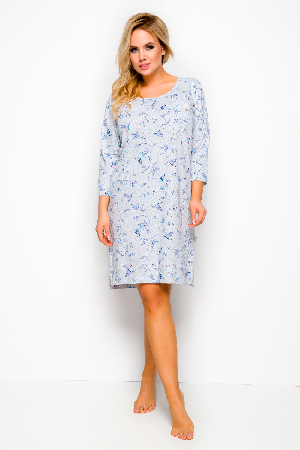 Женская ночная сорочка Mela. Сорочка серого цвета с цветочным орнаментом, с круглым вырезом горловины и планкой на пуговицах и длинным рукавом.