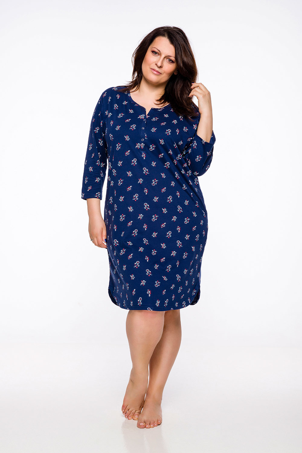 Сорочка Eni для дам с пышными формами выполнена из хлопкового полотна. Сорочка свободного кроя, с рукавом 3/4, круглым вырезом горловины и планкой на кнопках. Изделие темно-синего цвета с забавным принтом. Сорочку можно использовать как домашнее платье.
