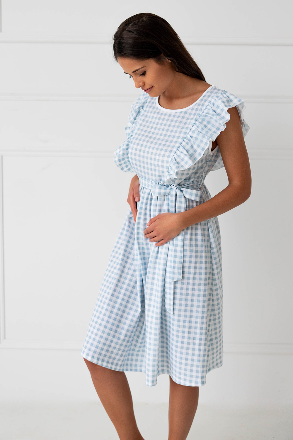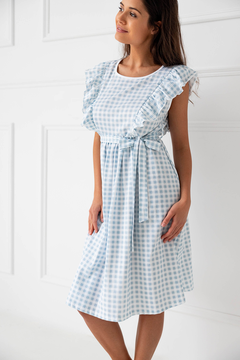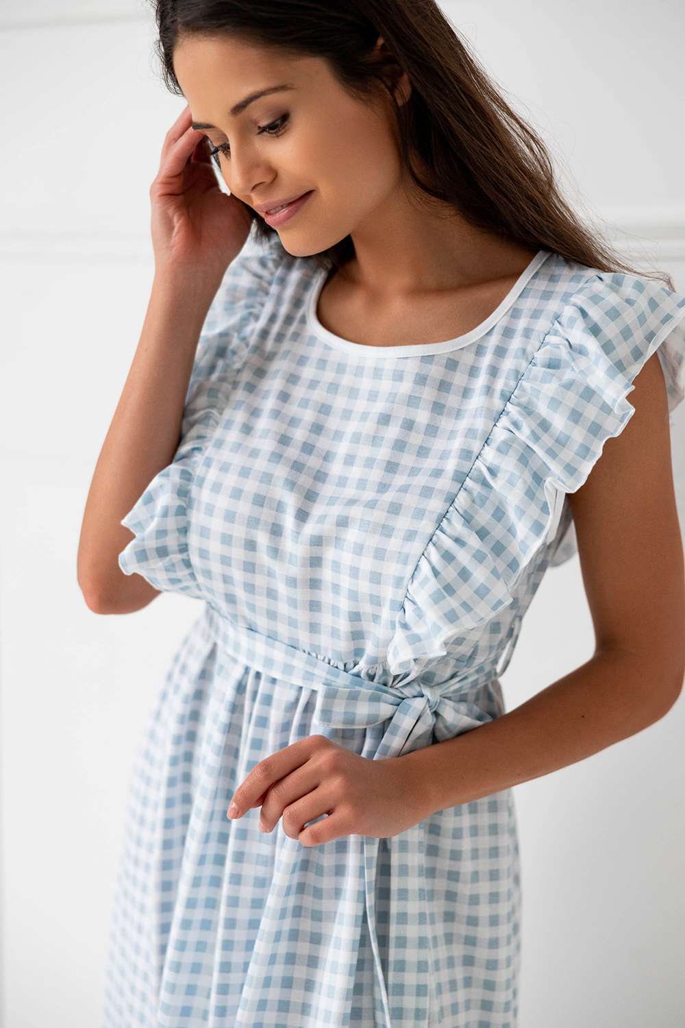 Ночная рубашка Beth идеальна как для беременных, так и во время грудного вскармливания. Складка под грудью красиво подчеркивает живот беременной, талия регулируется поясом. Вырез горловины украшен воланами с удобной застежкой на молнию, что облегчит кормление. Все дополняется нежным узором в бело-голубую клетку.