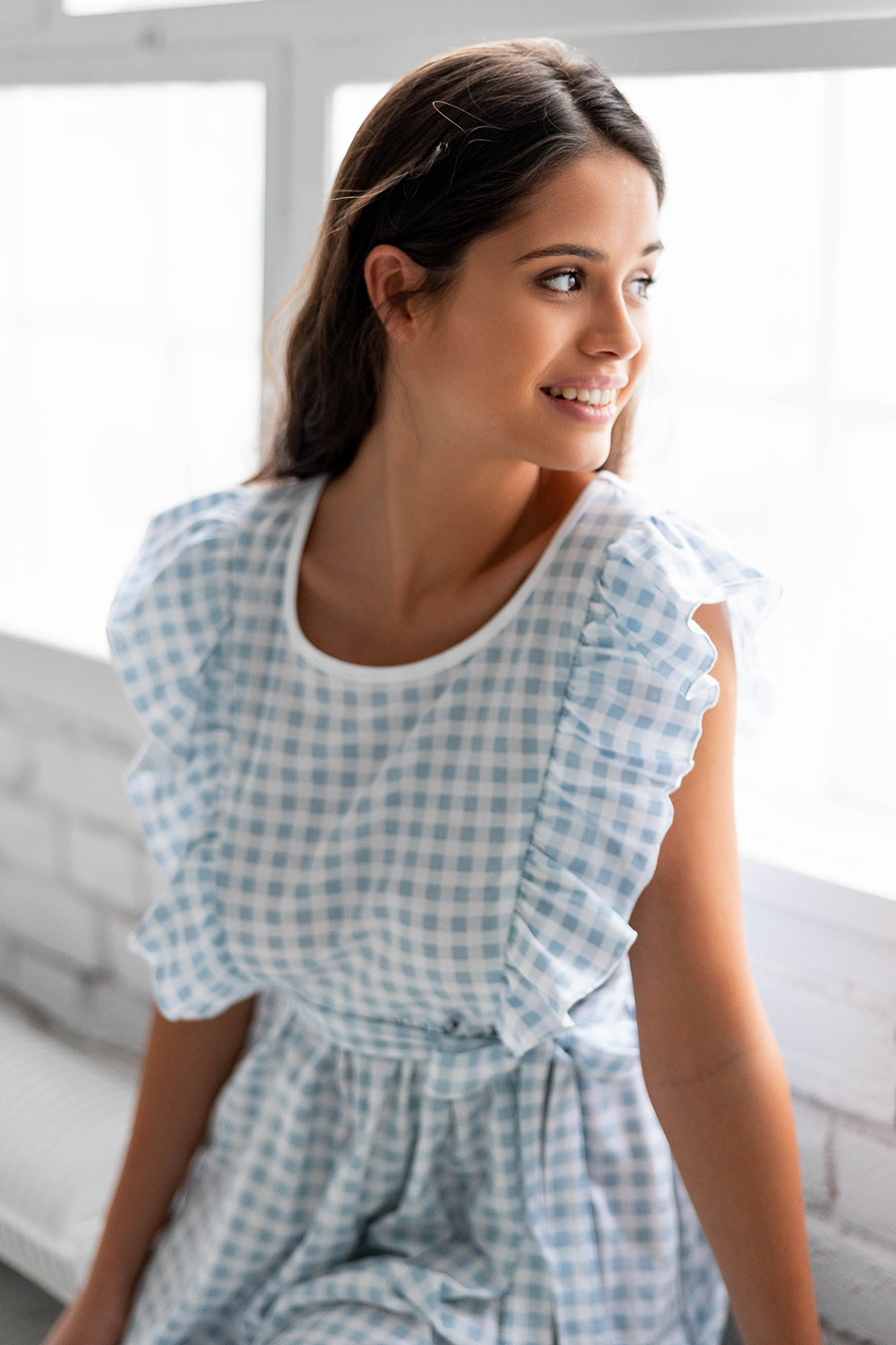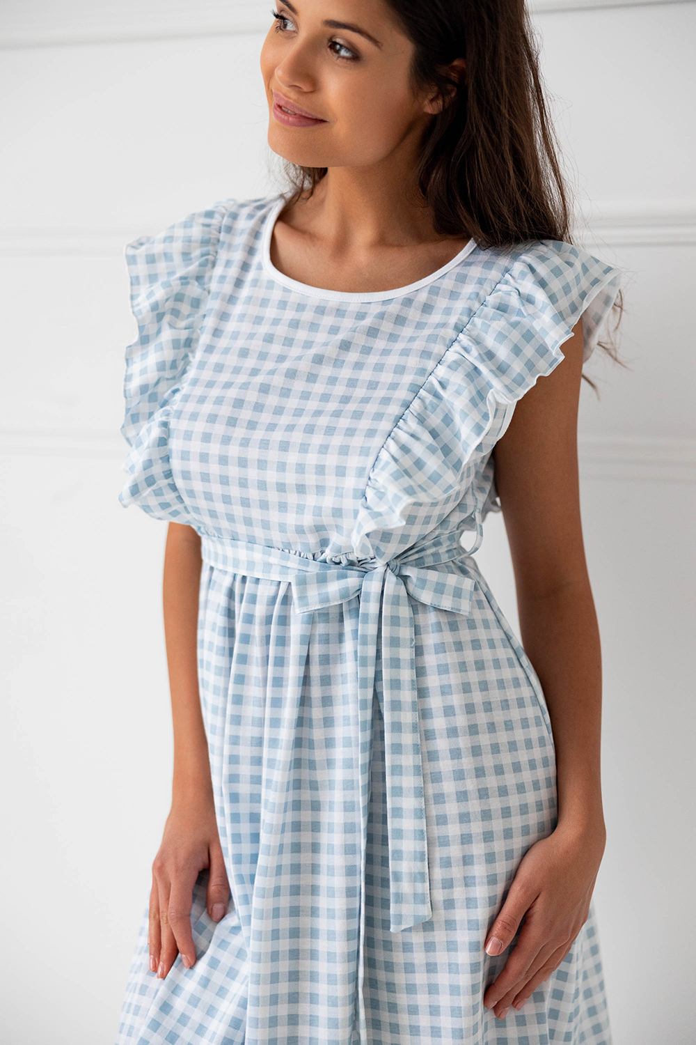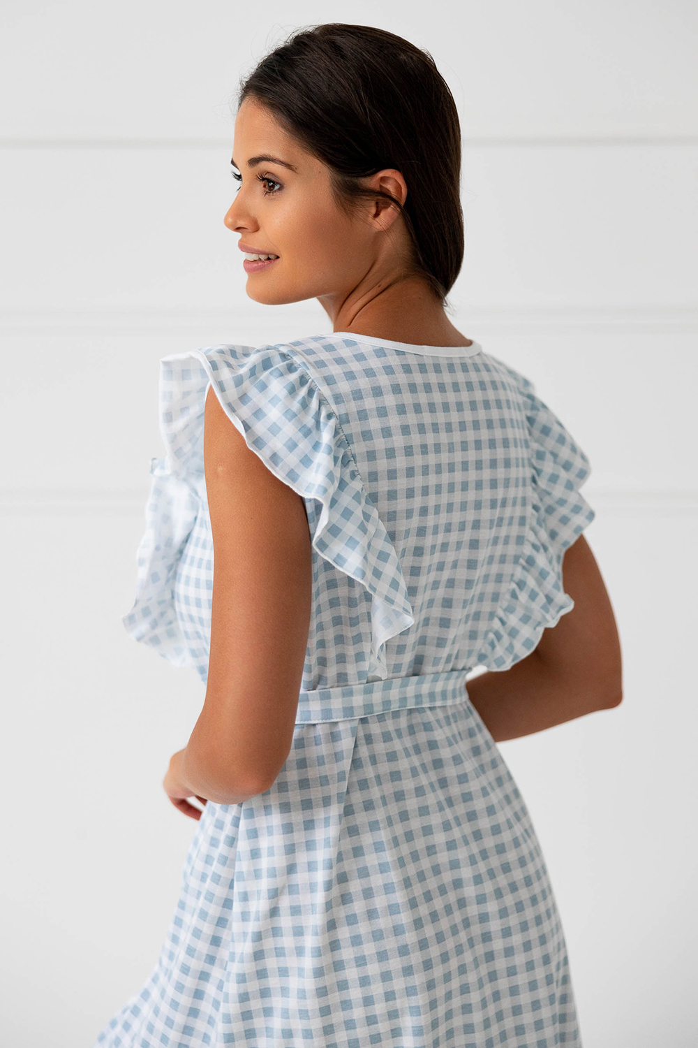 Ночная рубашка Beth идеальна как для беременных, так и во время грудного вскармливания. Складка под грудью красиво подчеркивает живот беременной, талия регулируется поясом. Вырез горловины украшен воланами с удобной застежкой на молнию, что облегчит кормление. Все дополняется нежным узором в бело-голубую клетку.
