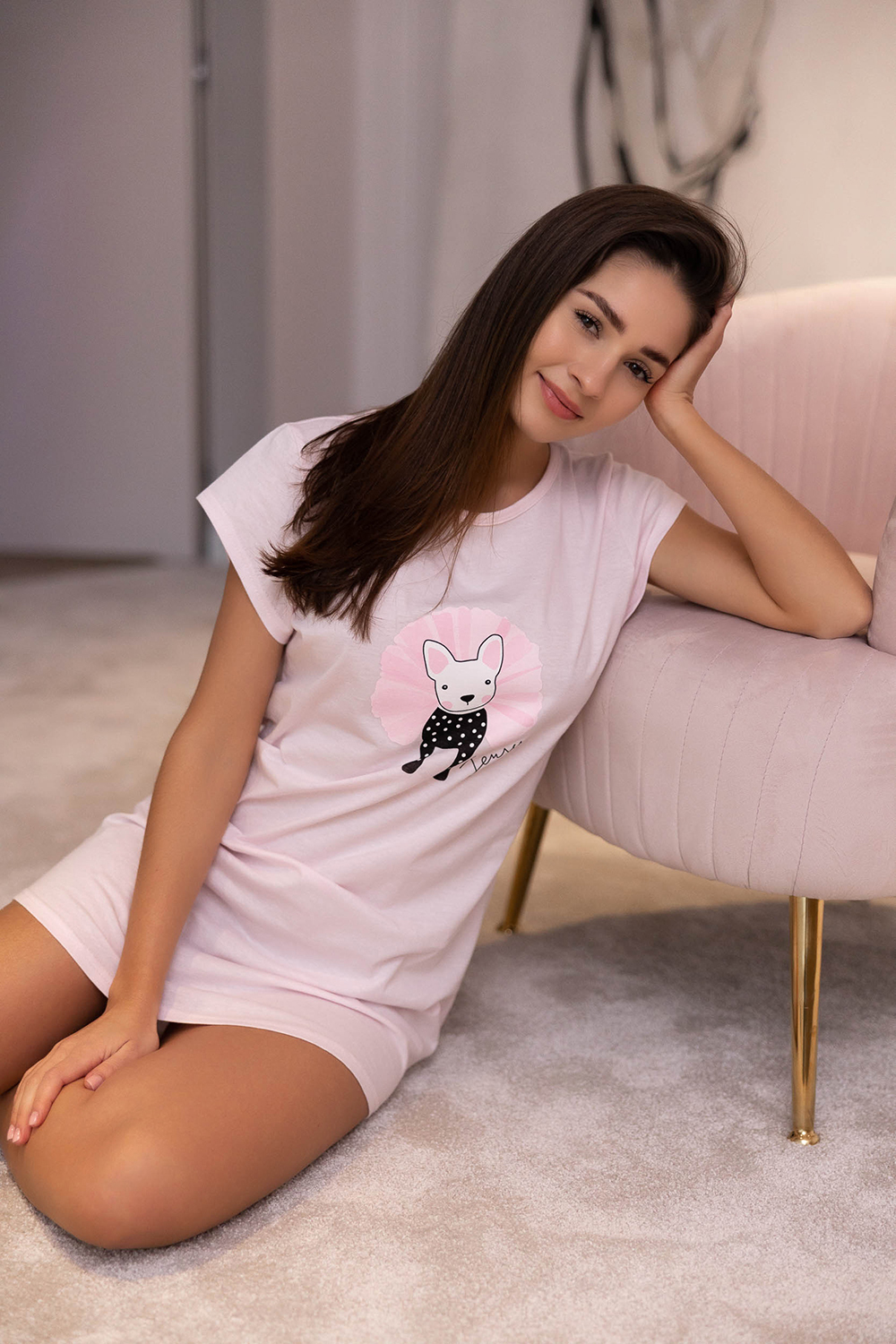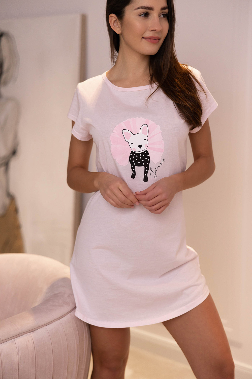 Хлопковая сорочка Mila свободного кроя, с коротким рукавом и круглым вырезом горловины. Изделие нежно-розового цвета, декорировано забавным принтом и надписью на груди. Идеальный вариант не только для сна, но и для домашнего отдыха.