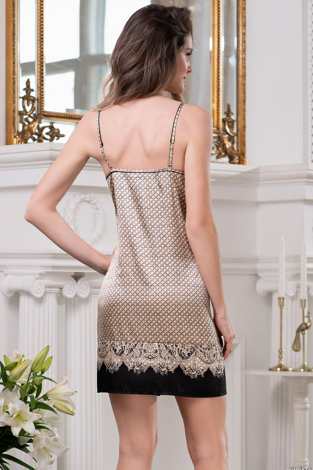 Короткая сорочка Mia-Amore на тонких бретелях без подреза под грудью, выполнена из смесового принтованного шелка с отделкой в виде контрастных кантов. По бокам расположены разрезы. Декор - двухцветный атласный бантик с подвеской по центру выреза.