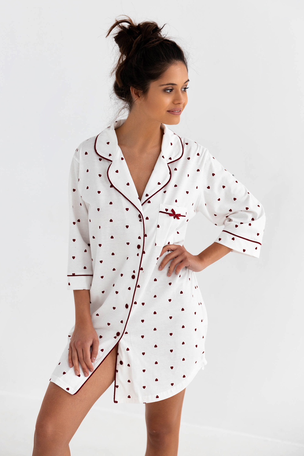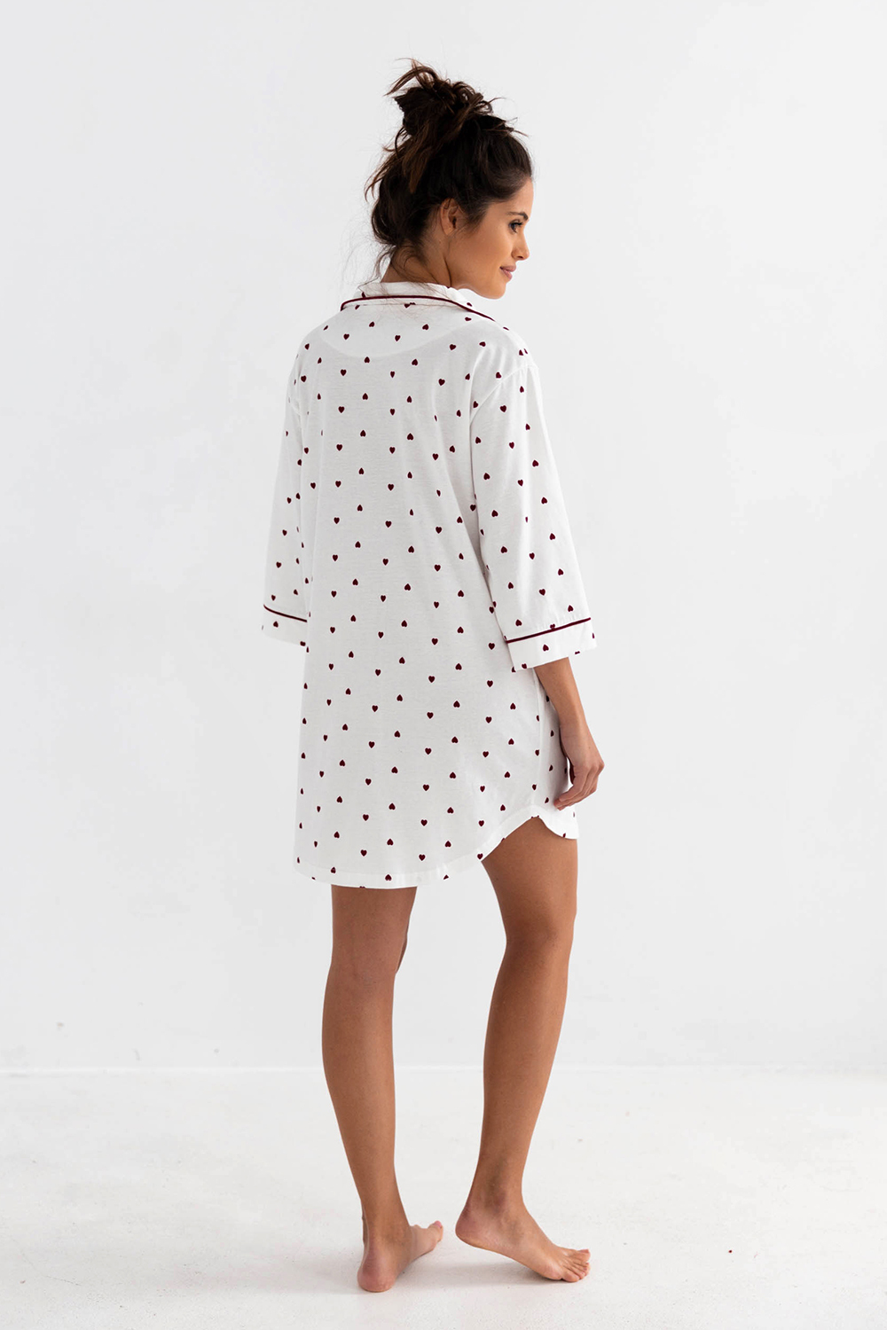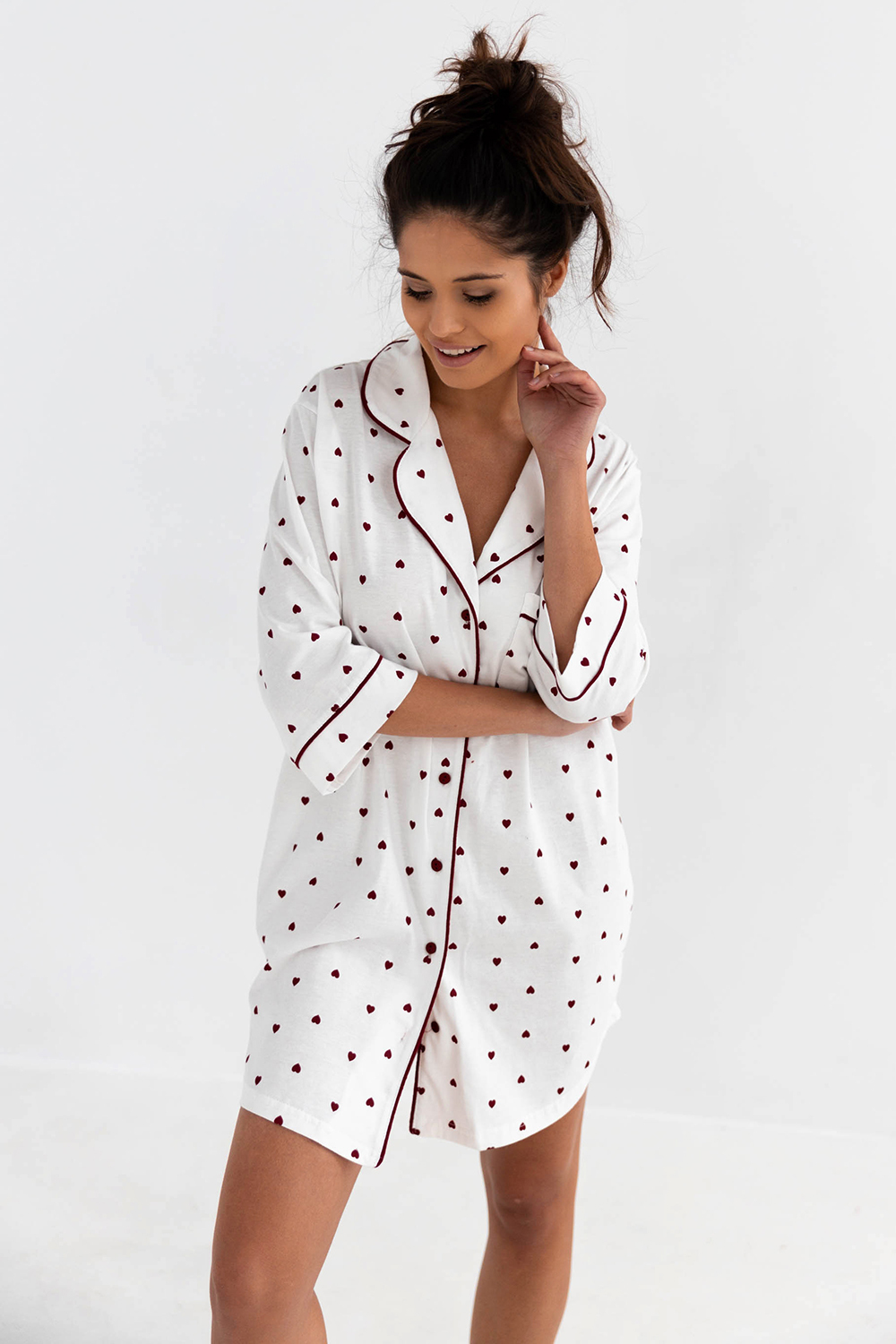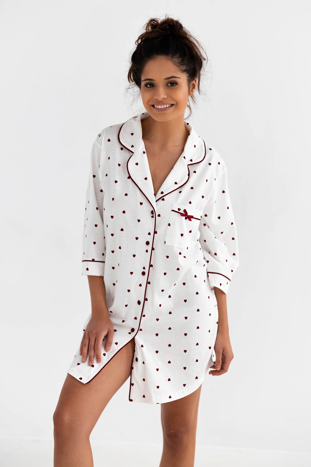 Хлопковая женская рубашка Simonette белого цвета с бордовыми сердечками. Изделие на пуговицах, свободного кроя, с рукавом 3/4 и отложным воротником. На верхней части полочки расположен накладной карман. Идеальный вариант не только для сна, но и для домашнего отдыха.