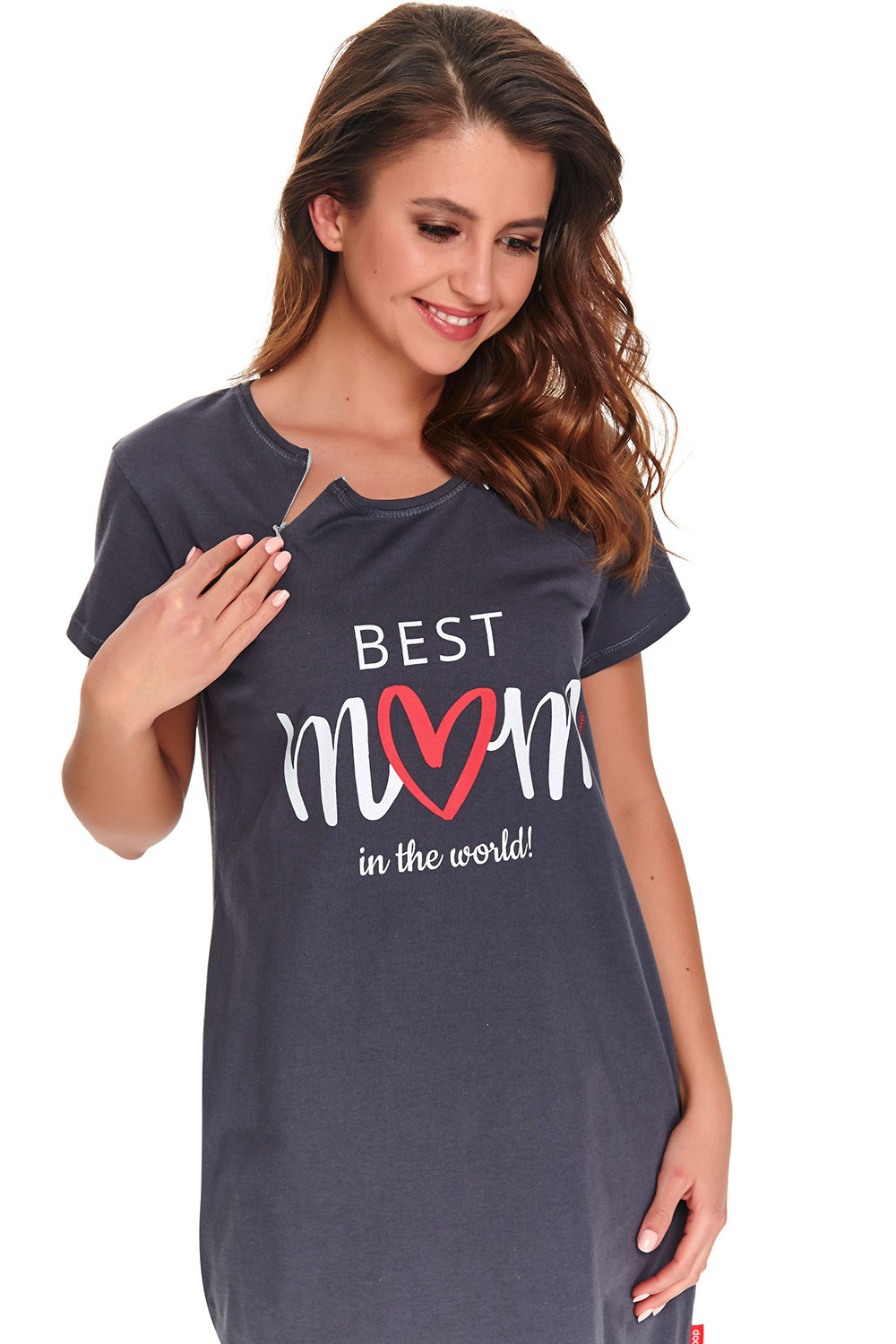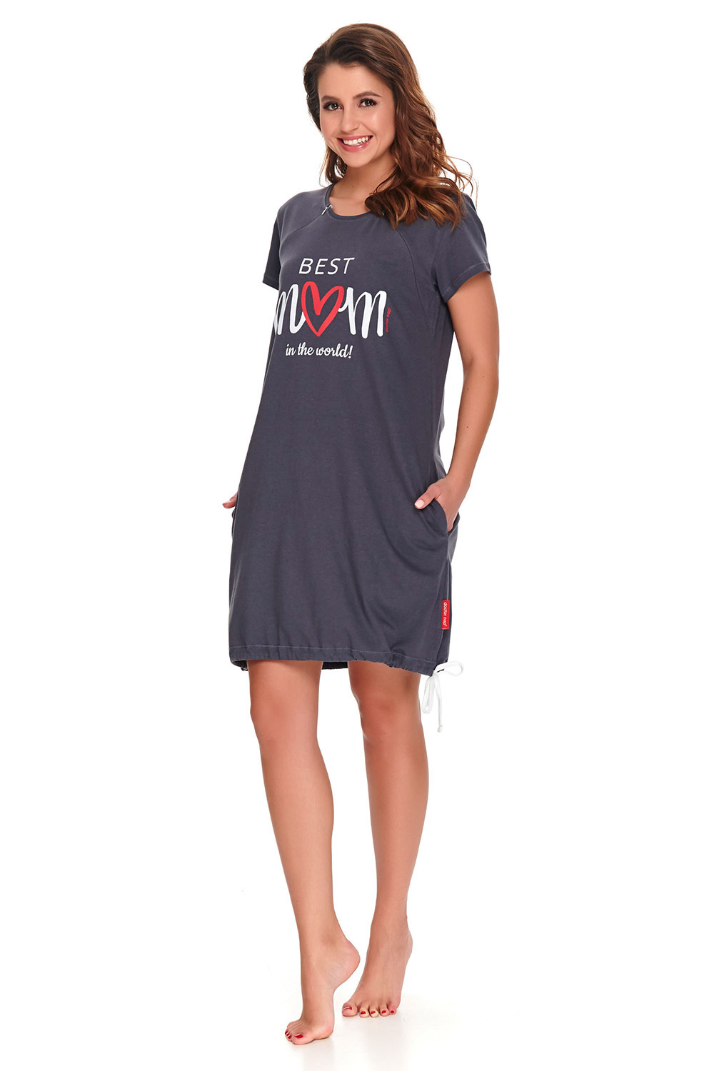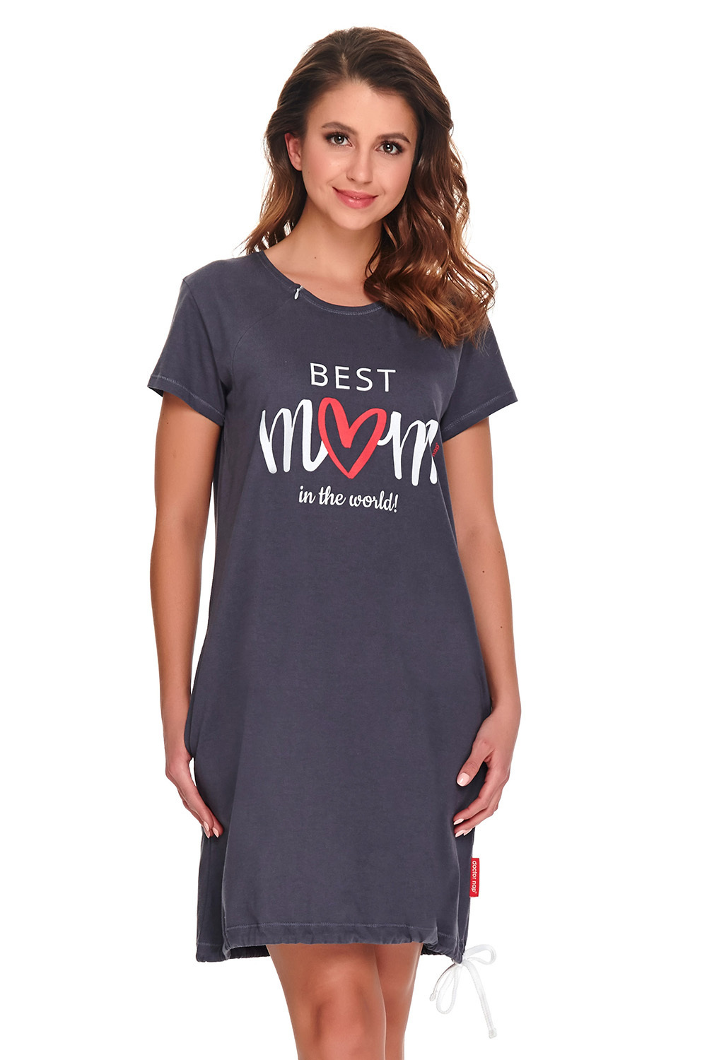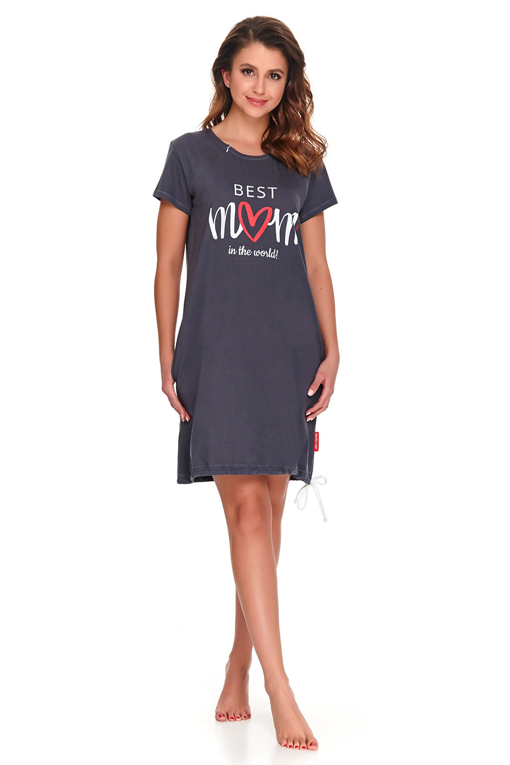 Хлопковая сорочка с надписью "Best Mom" на груди. Сорочка с двумя разрезами на замочках в области горловины, по подолу проходит стягивающая резиночка со шнурочком. Идеальный вариант не только для сна, но и для домашнего отдыха.