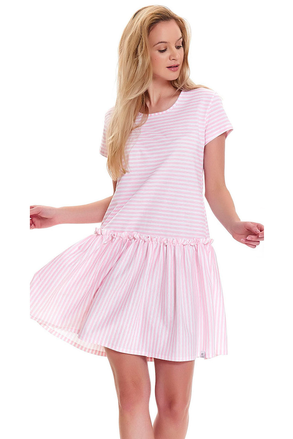 Хлопковая сорочка розового цвета в белую полоску TM.9442 Sweet Pink. Модель свободного силуэта с заниженной талией и пышной широкой оборкой, удлиненной по спинке.