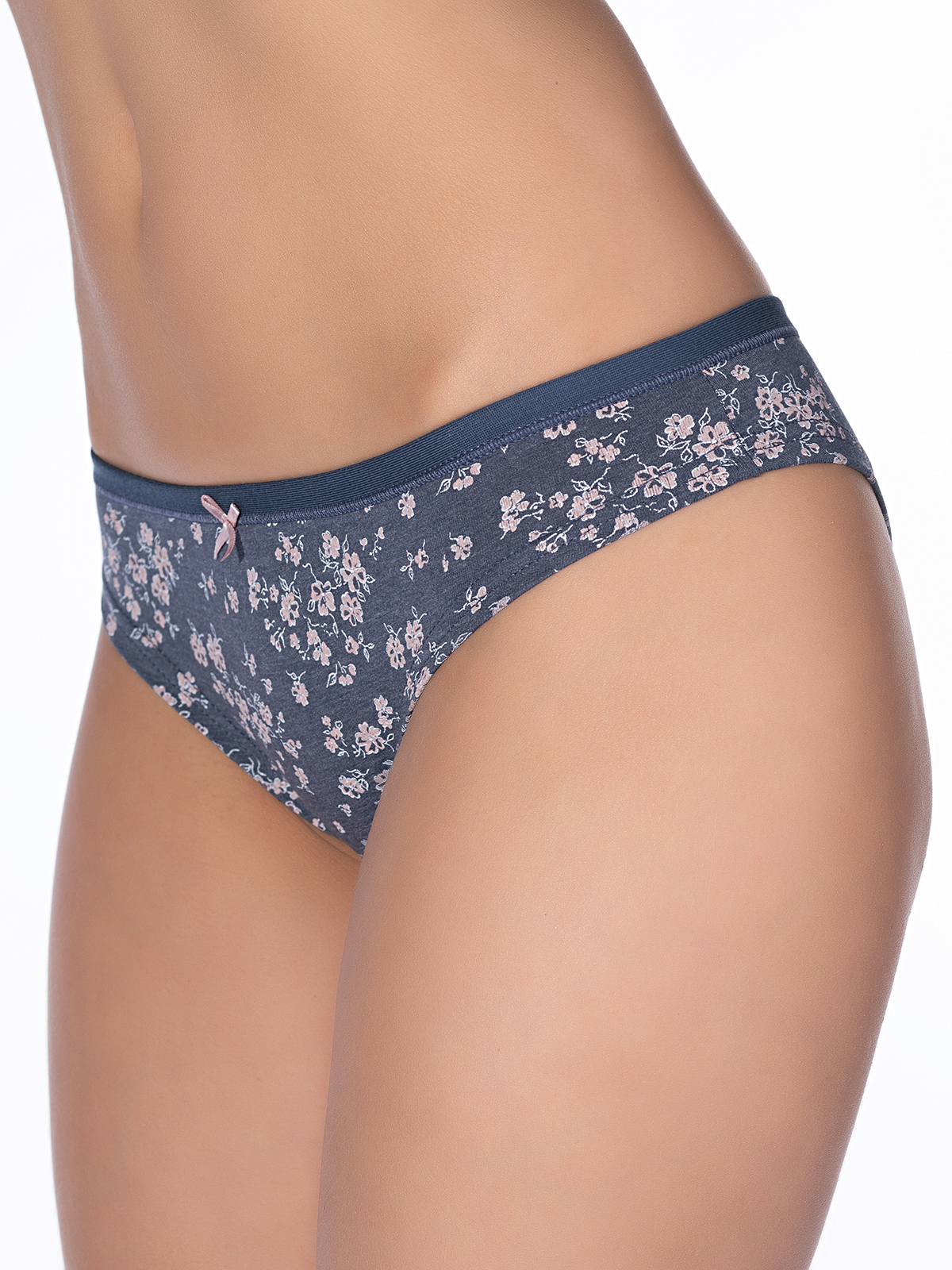 Трусы-бразильяна из эластичного хлопка, на поясе широкая вшивная резинка с бантиком спереди. Модель декорирована нежным рисунком "мелкие цветочки".