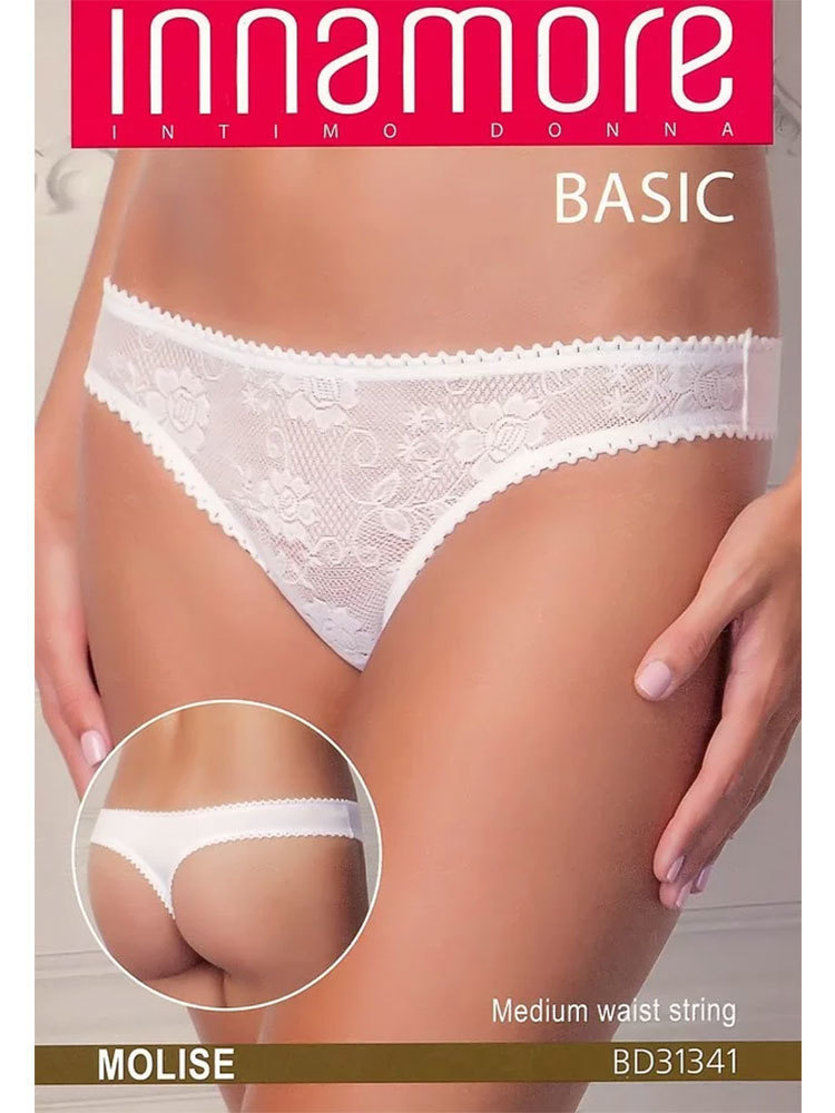 Женские трусы стринг со средней посадки на талии. Зауженная боковая часть. Изящная кружевная передняя часть и гладкое однородное хлопковое полотно сзади. Гигиеническая ластовица из хлопка. Отделка эластичной ажурной тесьмой по контуру.