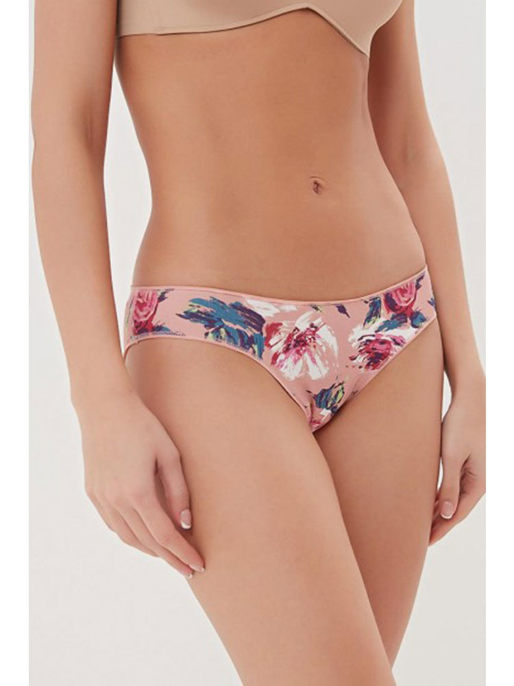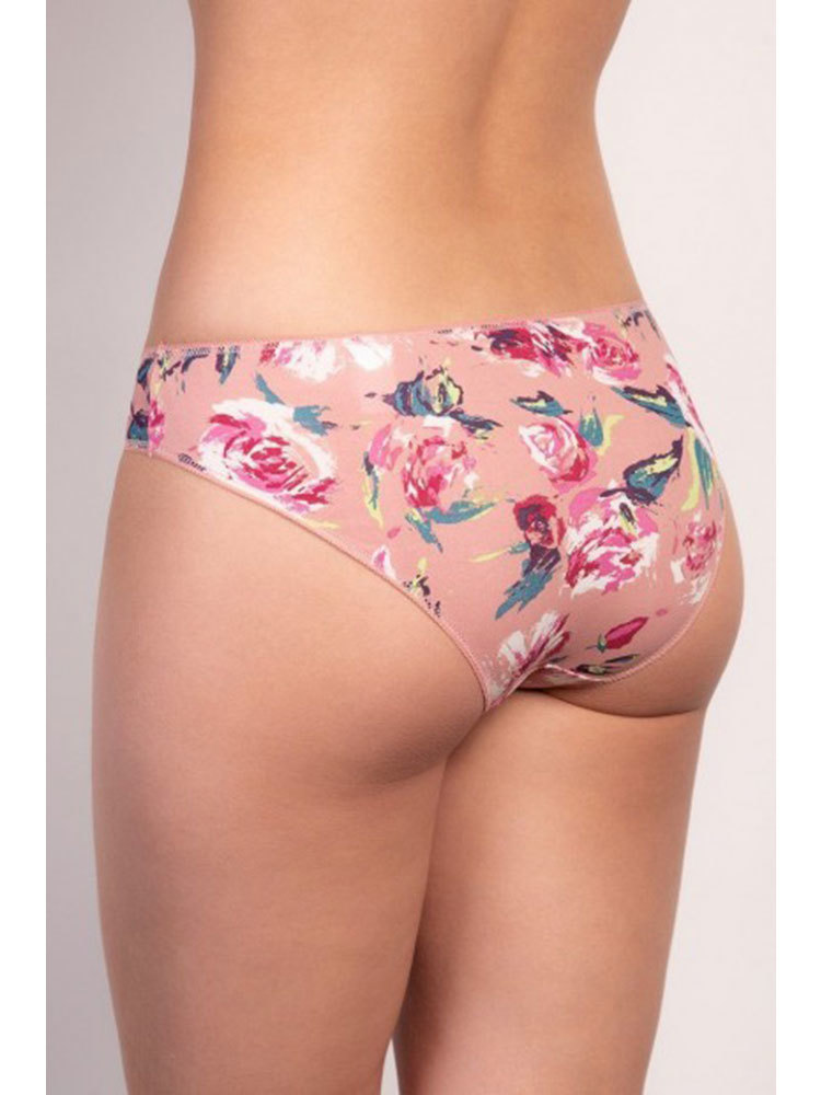 Женские фантазийные трусы слип с узкой боковой частью и печатным рисунком в виде ярких цветов роз на тёмно-розовом фоне. Классическая средняя линия талии.