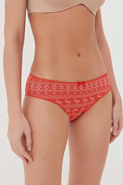 Женские трусиы слип со среденй боковой частью и заниженной линией талии. Из гладкого хлопка яркого красного цвета, с рисунком в оригинальном графическом стиле в виде звезд, ёлочек и оленей.