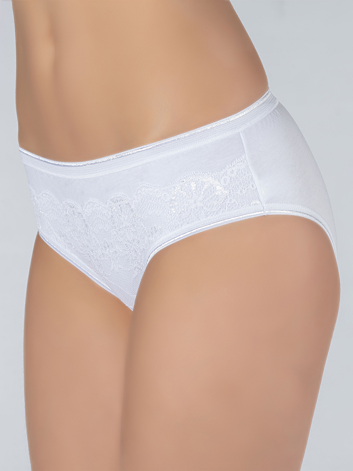 Женские трусы слипы из хлопка с эластаном, края отстрочены блестящей эластичной резинкой, на фронте объемная кружевная вставка с цветочным рисунком.