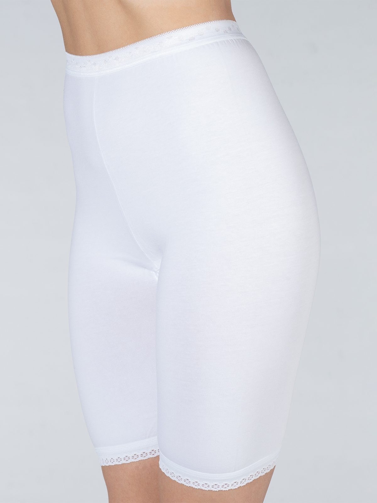 Высокие панталоны макси из хлопка с эластаном, края отстрочены широкой ажурной резинкой.