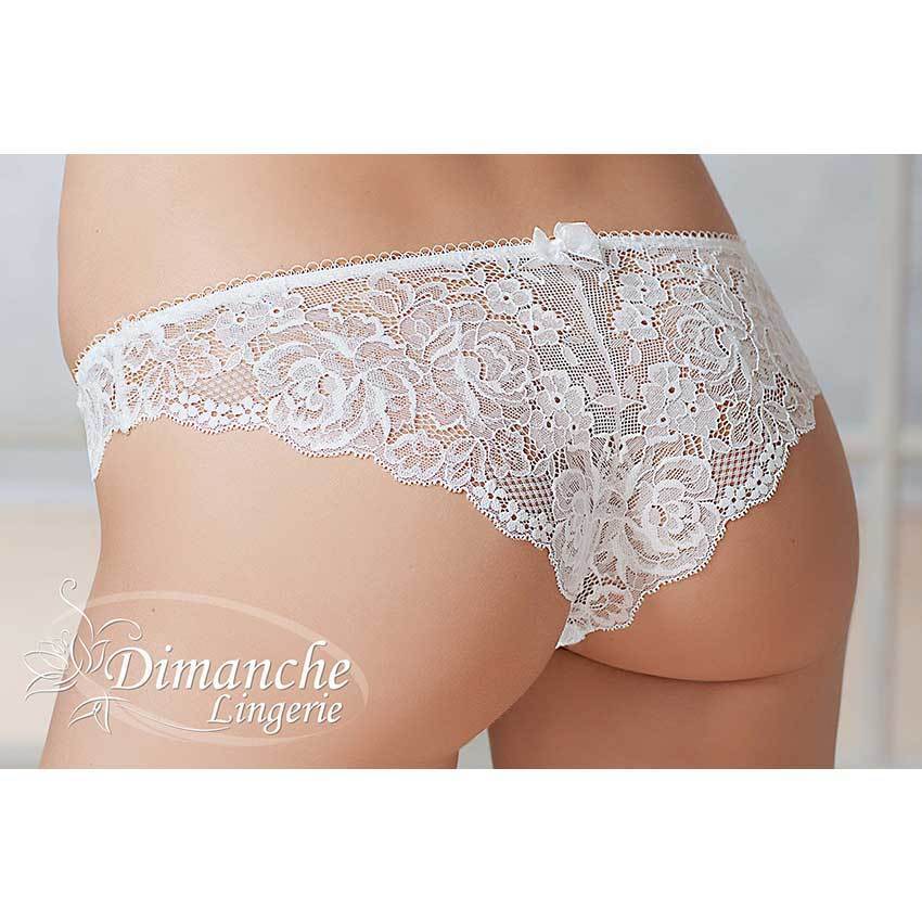 Кружевные полупрозрачные трусики бразилиана с заниженной линией талии, вставкой из непрозрачной микрофибры спереди, хлопковой гигиенической ластовицей и оригинальным маленьким бантиком, в качестве дополнительного украшения сзади на резинке.