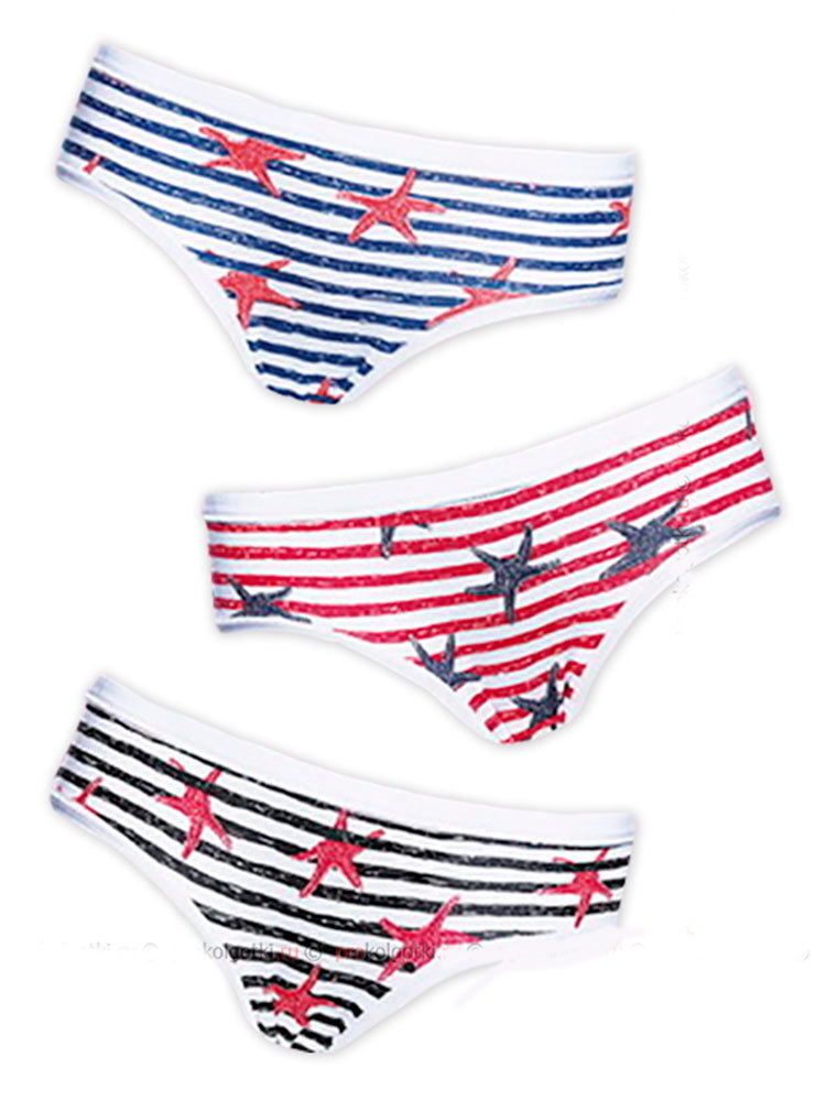 В упаковке 3 пары трусов с различными рисунками: слипы белого цвета с контрастной тонкими голубыми полосами и розовыми звездами, розовыми полосами и синими звездами, синими полосами и оранжевыми звездами.