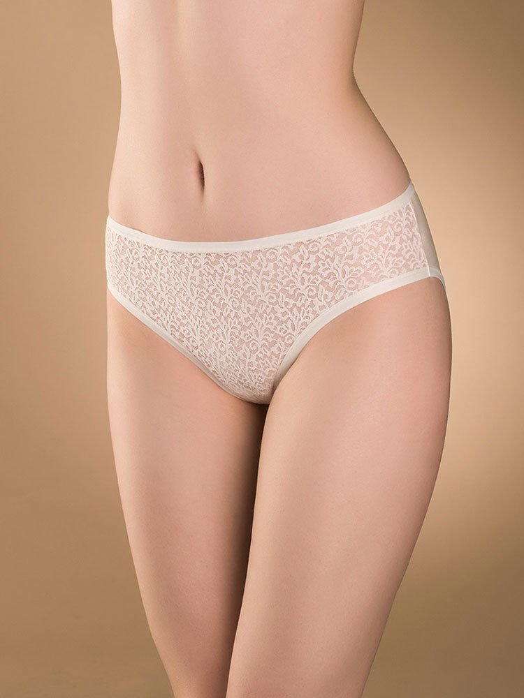 Женские трусы слип с классической средней линией талии. Легкое ажурное кружевное полотно на контрастной подкладке создает эффект тату. Задняя деталь из шелковистого эластичного полотна. Мягкие тесьмы по верхнему и нижним срезам. Нижние срезы обработаны плоским швом. Максимально незаметны под одеждой.
