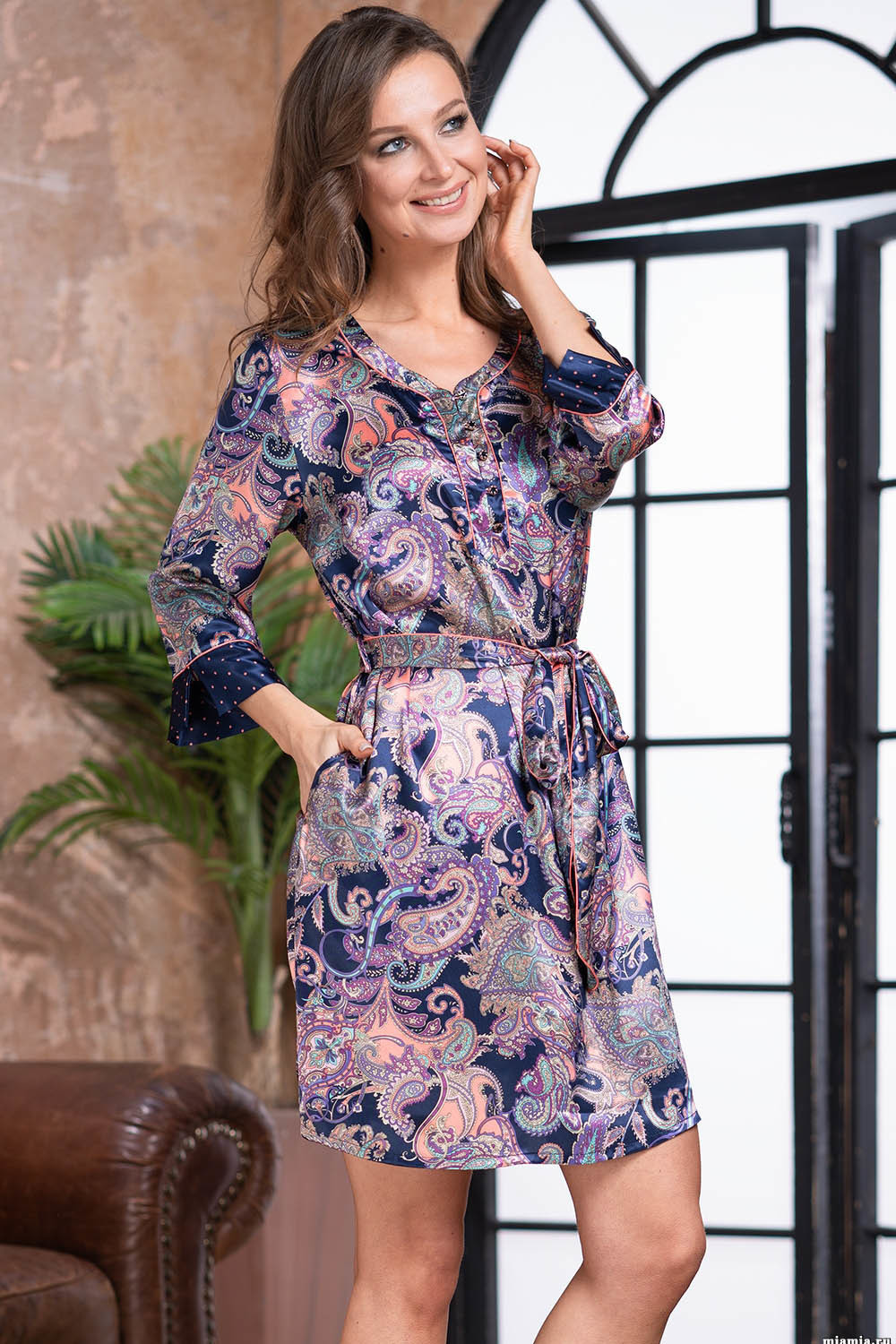 Туника Mia-Amore свободного силуэта с рукавом 3/4, выполнена из принтованного смесового шелка. По центру обработана застежка на пуговицы. Низ рукавов обработан тканью - компаньоном. В боковых швах обработаны карманы, а по низу разрезы. Туника дополнена поясом.