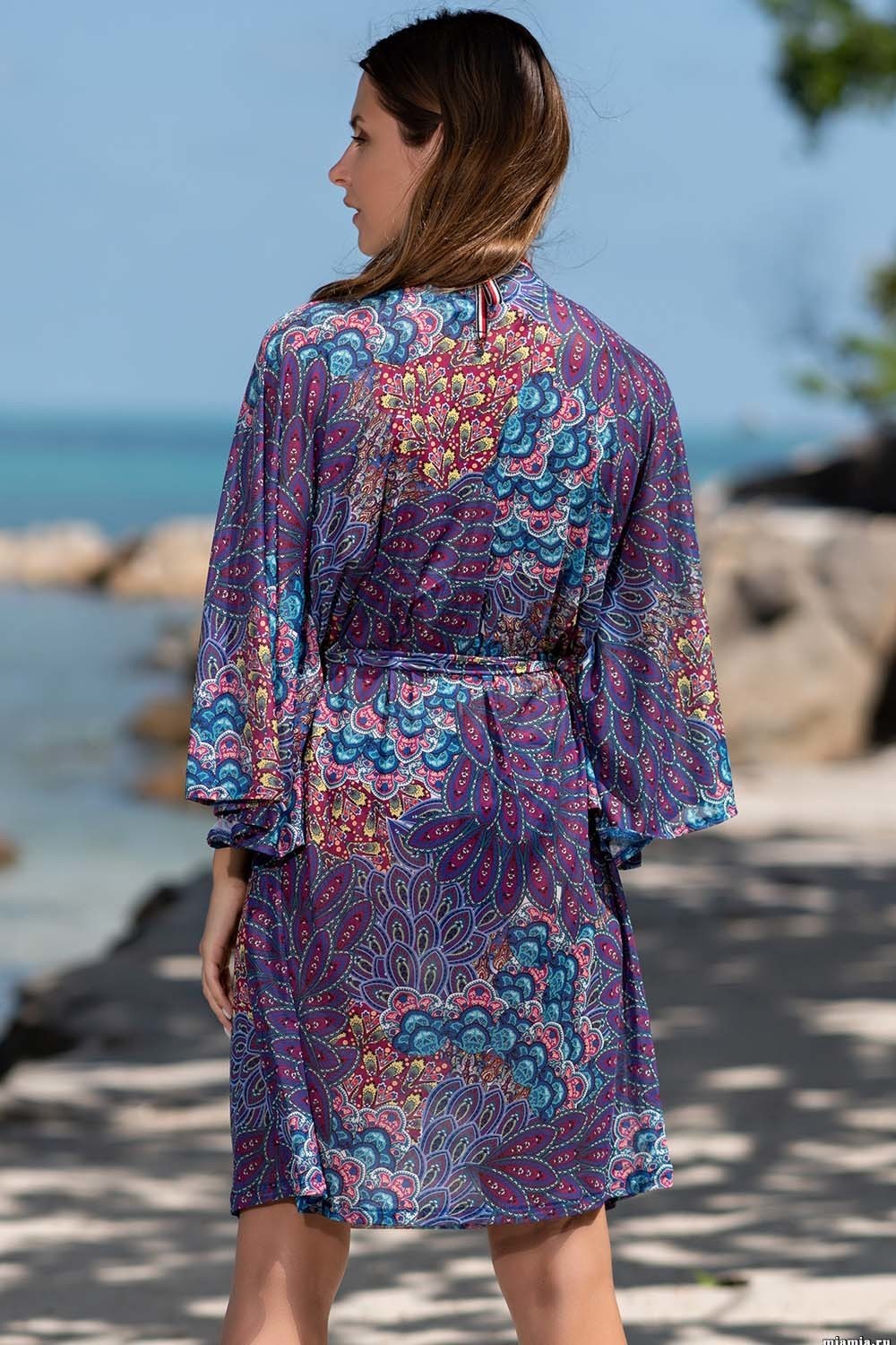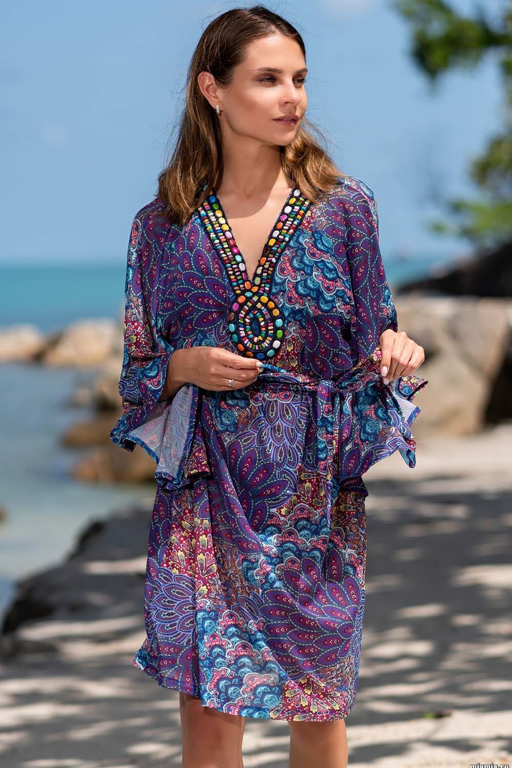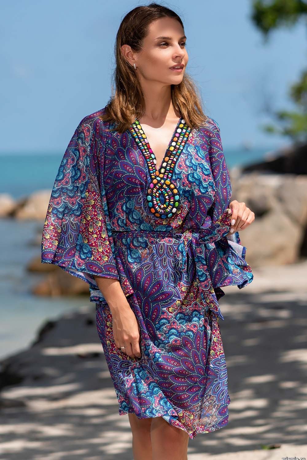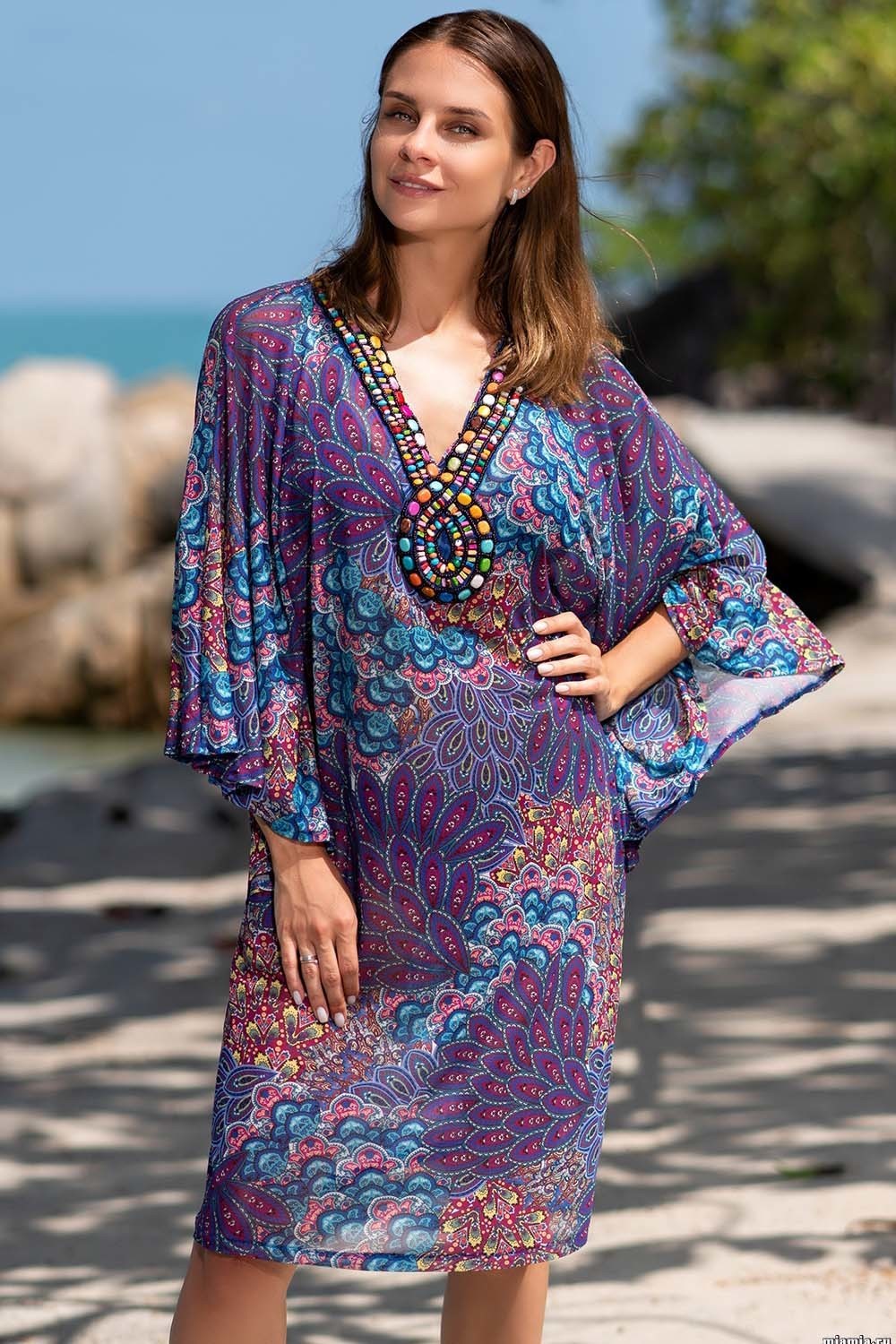 Короткая туника Mia-Amore со спущенным рукавом выполнена из тонкой гигроскопичной мягкой принтованной сетки. Принт в виде сложного узора с элементами восточных орнаментов. Вырез туники украшен эффектной бижутерией ручной работы из множества разных бусин.