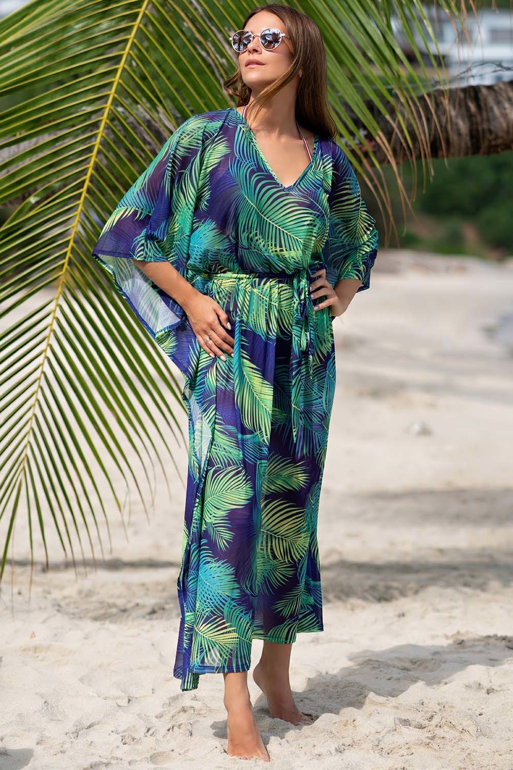 Длинная туника свободного силуэта со спущенными рукавами выполнена из тонкой гигроскопичной мягкой принтованной сетки. Сетка принтована ярким рисунком в виде пальмовых листьев разных оттенков - от салатового до глубокого изумрудного. Ширина туники может регулироваться по талии поясом.