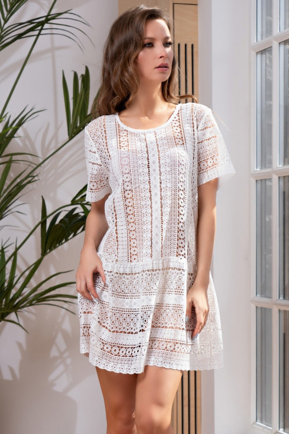 Туника Mia-Amore с круглым вырезом из хлопкового кружевного полотна с коротким рукавом. Низ обработан кружевной оборкой.
