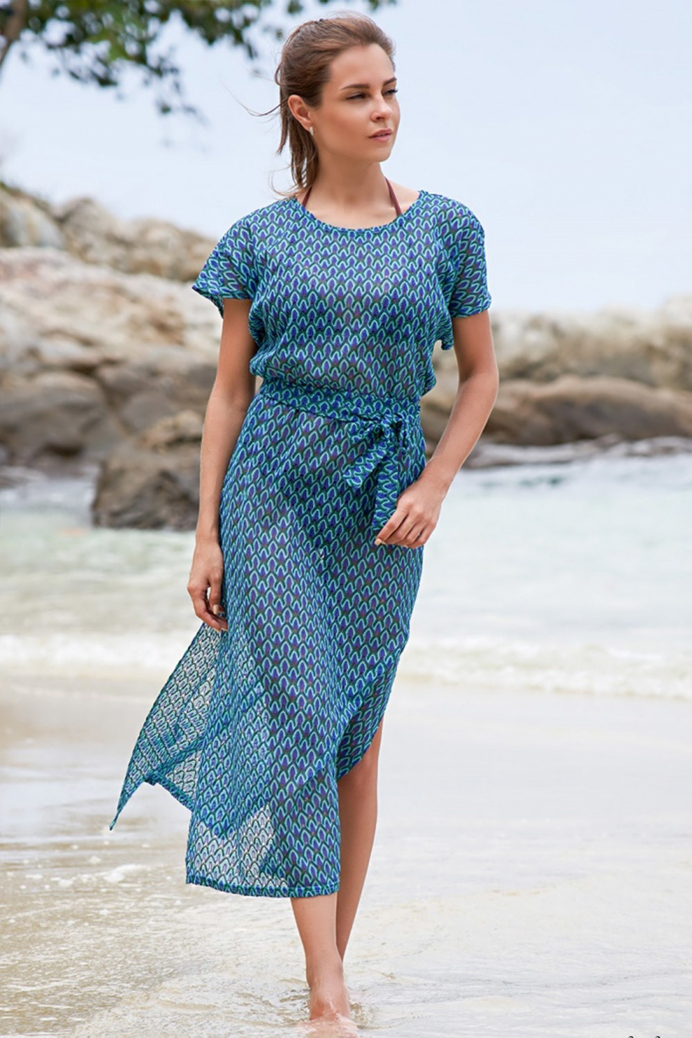 Длинная туника c коротким рукавом Mia-Amore выполнена из ажурного трикотажного полотна. По бокам туники разрезы. Ширина туники по талии регулируется при помощи декоративного шнура с кисточкой.