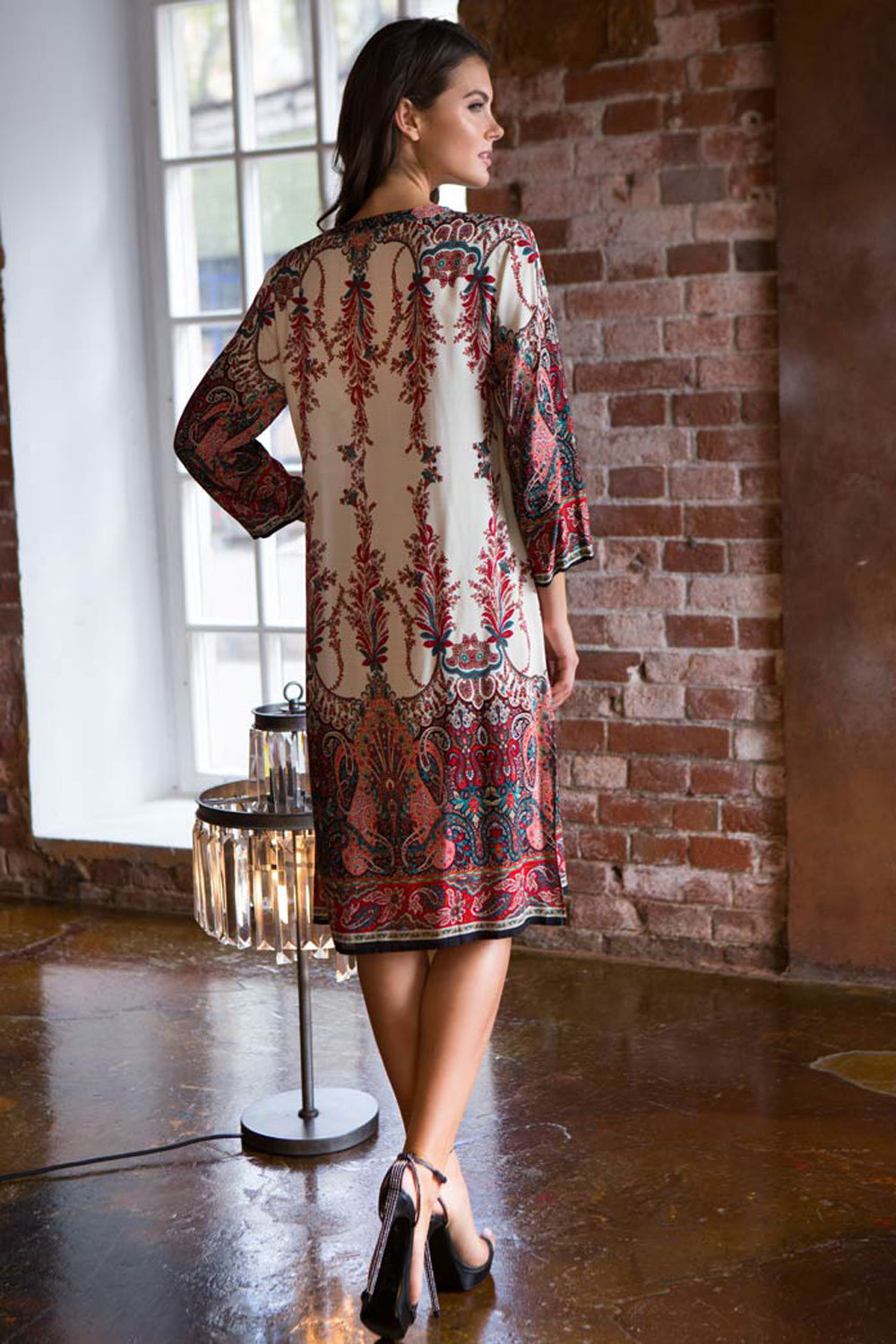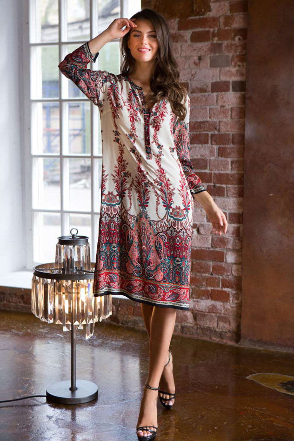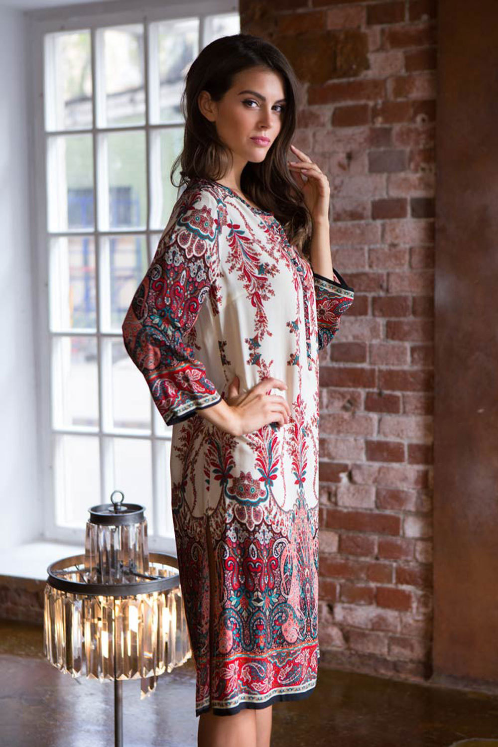 Длинная туника Миа-Миа прямого силуэта с круглым вырезом горловины на полочке и спинке из вискозы с фантазийным принтом. Модель с втачными широкими рукавами. Круглый вырез горловины полочки и спинки обработан притачной фигурной обтачкой. V-образный разрез на горловине полочки обработан притачной планкой. Планка туники застегивается на петли и обтяжные пуговицы из основной ткани.
