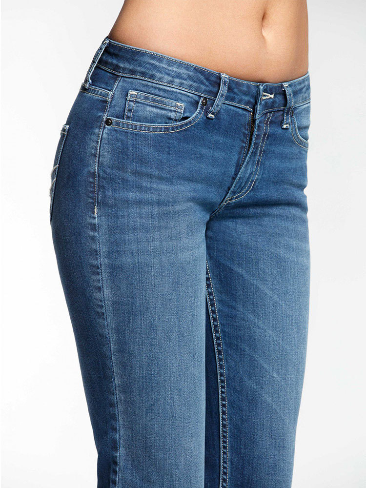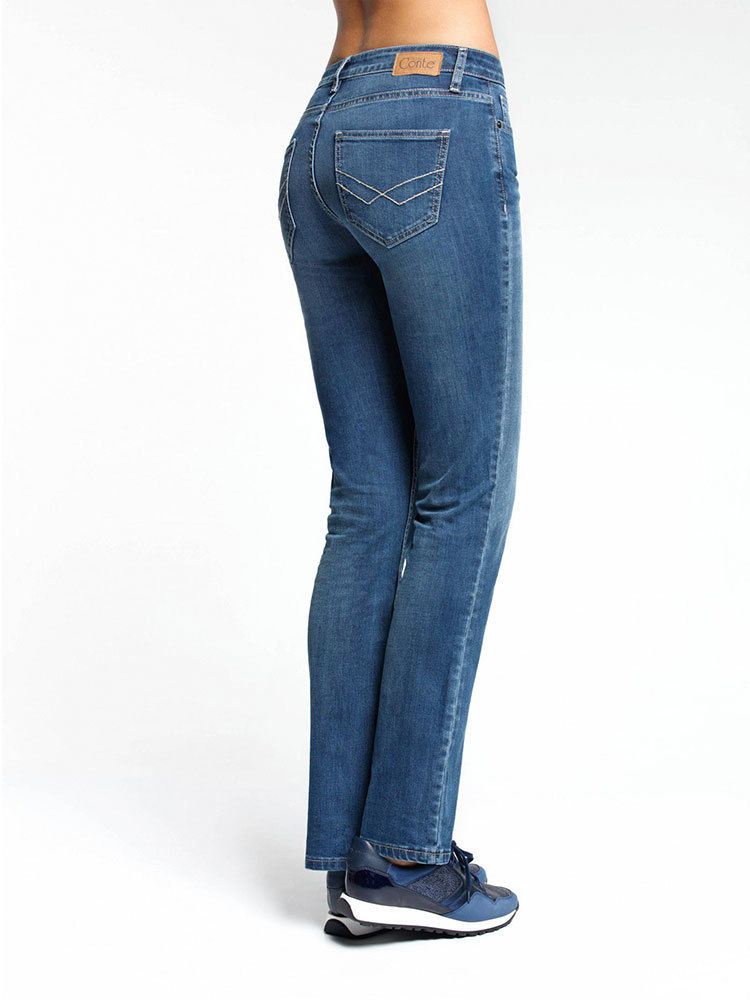 Женские джинсы из плотной мягкой ткани синего оттенка 10,5 Oz. Пять карманов. Средняя посадка на талии. Прямая модель.